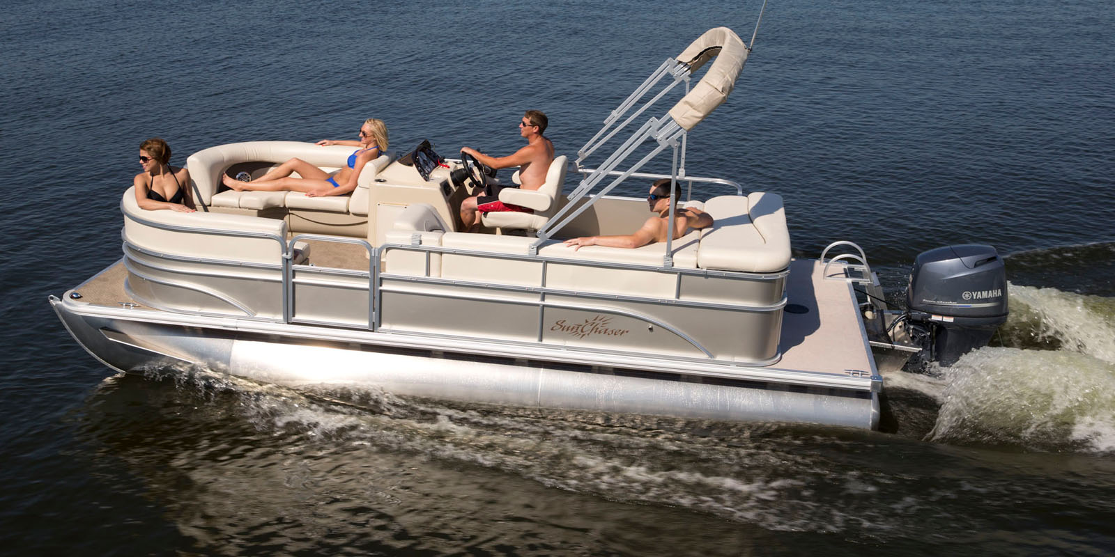 Как полагается, оборудование понтон-бота выполнено на высоком технологическом уровне — а кто бы сомневался? Диванные рундуки модульного типа, из термопласта, их крышки удобно открываются наружу, внутри много места для пикниковых корзин и необходимых на воде спас-жилетов. Фальшборт из гнутых панелей и квадратных алюминиевых труб по периметру платформы смотрится очень симпатично. Свободные площадки на носу и корме облегчают доступ к воде — купайся сколько хочешь. Два опциональных кресла на открытой носовой платформе выглядят захватывающим аттракционом — но сидеть там на ходу не стоит, только половить с них рыбу на стоянке. Ну и американцы изменили бы себе, если бы не добавили в оборудование складной кабинки для переодевания. Приватность на борту превыше всего, даже условная, за занавеской.
